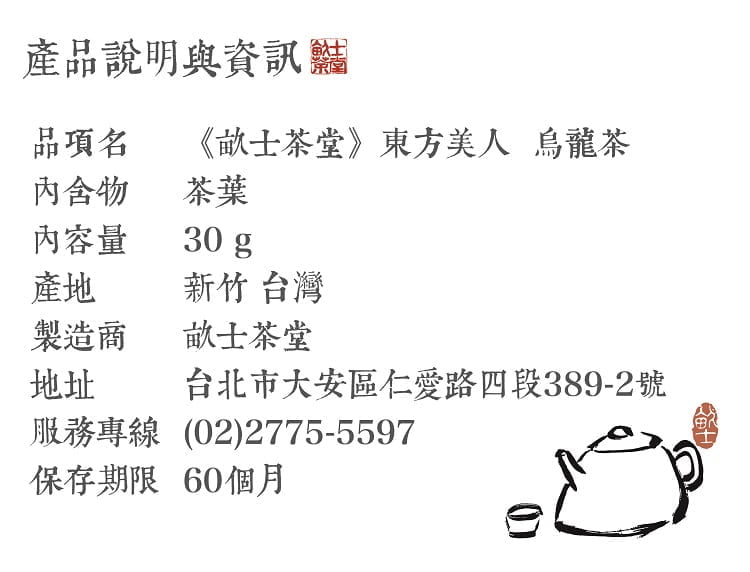 品種:青心烏龍 產地:坪林 發酵:輕氧化(發酵) 香型:高雅的蘭花香氣、 滋味:清香清爽的花甜香 層次:3.5顆星 內容量:3兩