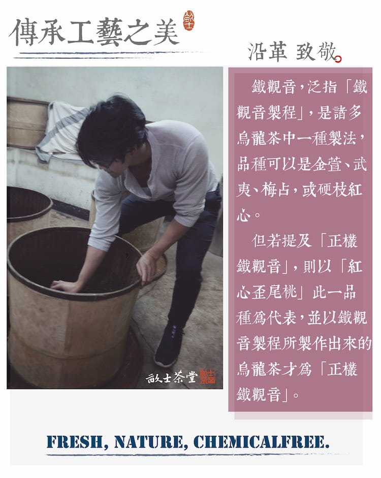 Taiwanese Tie Guan Yin refers to teas made using the “special Tie Guan Yin processing method.” Varieties used can include Jin Xuan金萱, Wu Yi武夷, Mei Zhan梅占, or hard stem Red Heart硬枝紅心. However, when referring to ” Authentic Tie Guan Yin,” it specifically indicates teas made using the Tie Guan Yin processing method from the “Red Heart Crooked Tail Peach紅心歪尾桃” variety.
